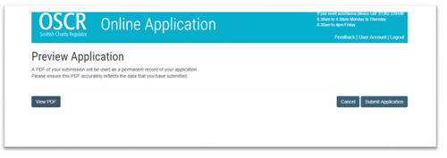 On this page, you must click View PDF before the Submit Application button becomes available. After clicking View PDF, please ensure the PDF accurately reflects the data that you have submitted.