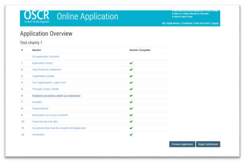 Once there is a green tick next to every section the form will allow you to select Begin Submission.  Clicking this button will take you to the Preview application page.