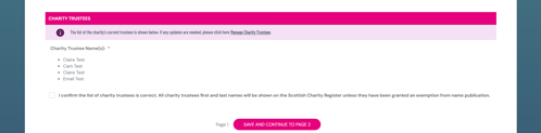 You will see in this section a list of the charity trustees that have been submitted to OSCR in the ‘Manage Charity Trustees’ section.