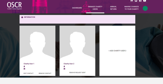 Charity users are individuals who can log in to OSCR Online to submit an online annual return and make certain changes. They will receive communications from OSCR when we require information from a charity. A charity can have up to three charity users