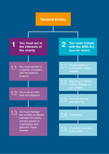 The general and specific duties apply equally to all charity trustees and to all charities registered in Scotland. All of the charity’s trustees should work together to make sure that these duties are met.