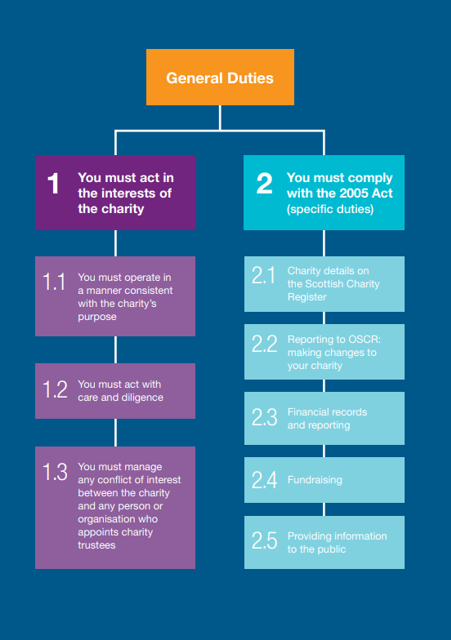 Charity trustee duties are set out in the Charities and Trustee Investment (Scotland) Act 2005 (the 2005 Act).