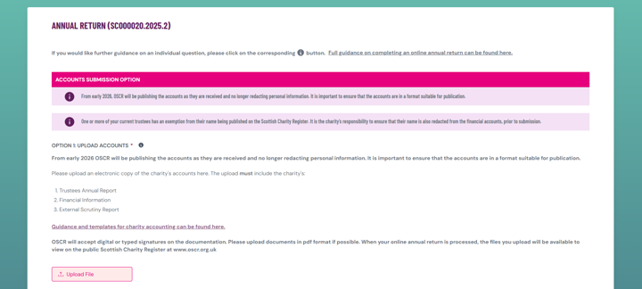 If you are unable to upload your accounts, please click on the button to confirm that you will post a copy of the charity's signed accounts