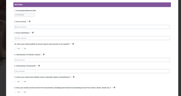 Section A asks some basic information about the charity.